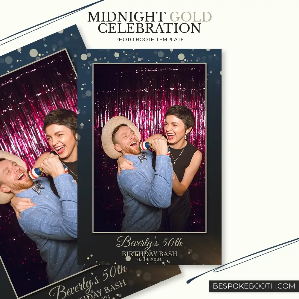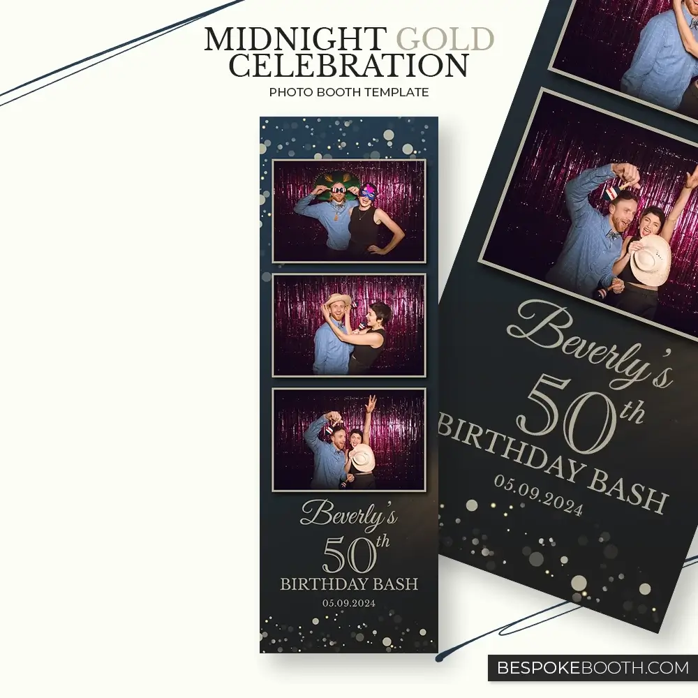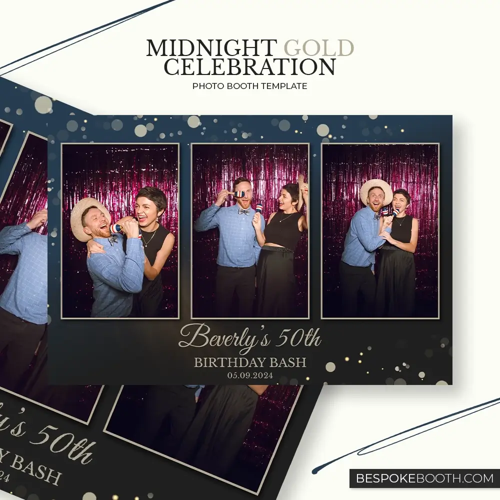 The Midnight Gold Celebration photo booth template is designed to bring instant elegance to any Birthday Party or evening event. Using a rich midnight blue color palette layered with soft, floating gold Bokeh lights, this design creates a luxury atmosphere that photographs beautifully both on screen and in print. The layout options include classic portrait frames and multi-photo strip formats, making it easy for photo booth owners to offer variety while maintaining a consistent high-end look. Clean typography and balanced spacing ensure guest photos remain the focus while still delivering strong visual branding for milestone birthdays and upscale celebrations.