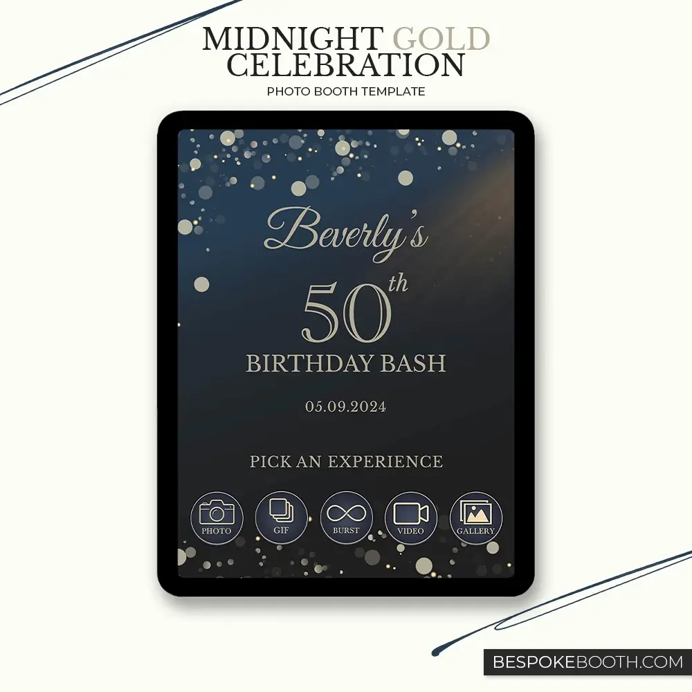 To complete the experience, the matching Start Screen design mirrors the same midnight and gold aesthetic, giving booths a polished and professional interface from the very first tap. Together, the templates and start screen create a cohesive system that feels modern, festive, and premium. These photo booth templates are ideal for operators who want to stand out at birthday events, attract higher-value clients, and deliver visuals that feel tailored for luxury parties, social sharing, and memorable keepsakes.